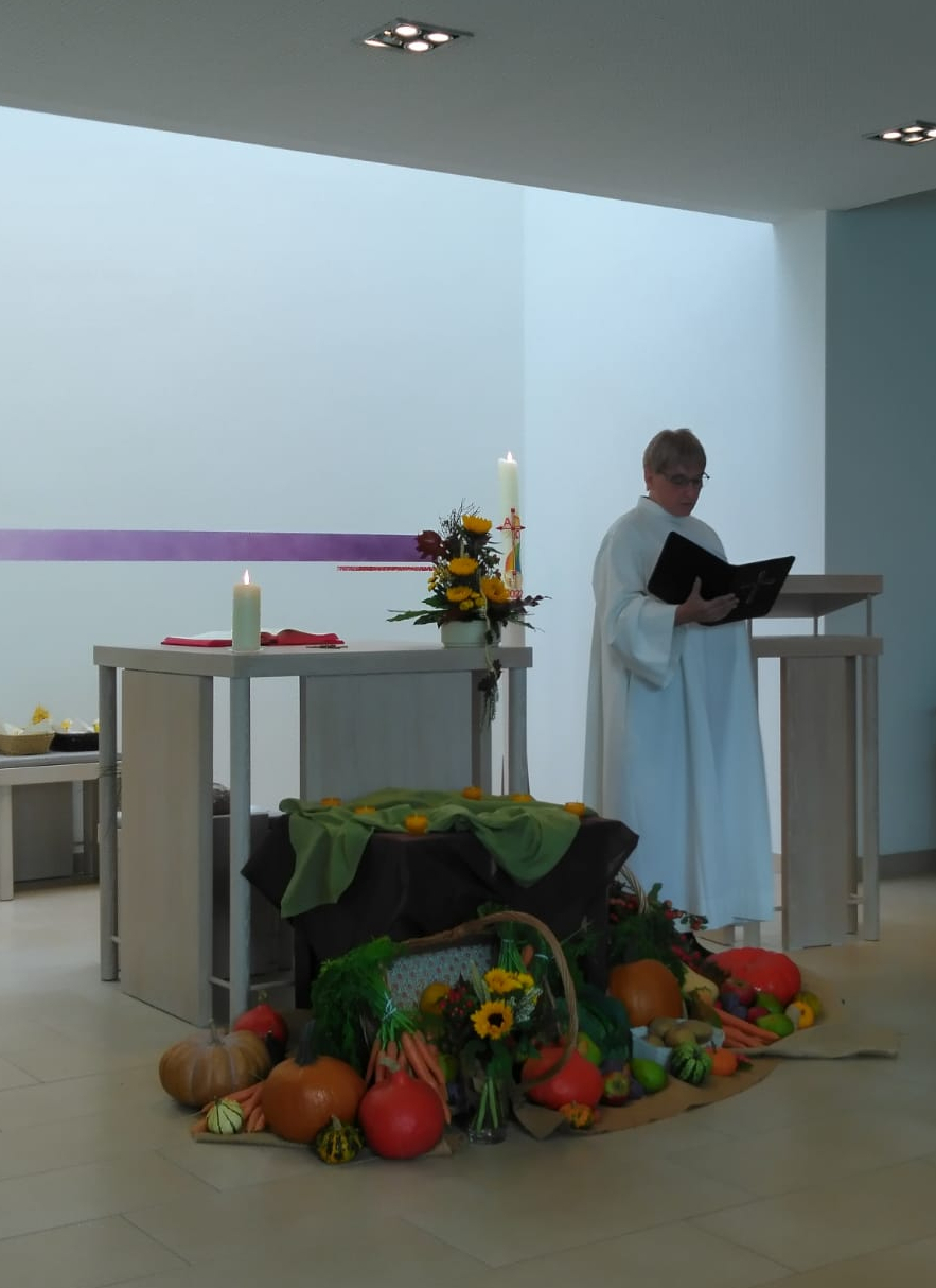 Die Gaben des Erntedankaltares werden wir diese Woche gemeinsam mit den Bewohnern zu einer leckeren Gemüsesuppe und einer Kürbissuppe verarbeiten und so an die schöne, gemeinschaftliche Erfahrung des Gottesdienstes und des Beisammensein danach anknüpfen.