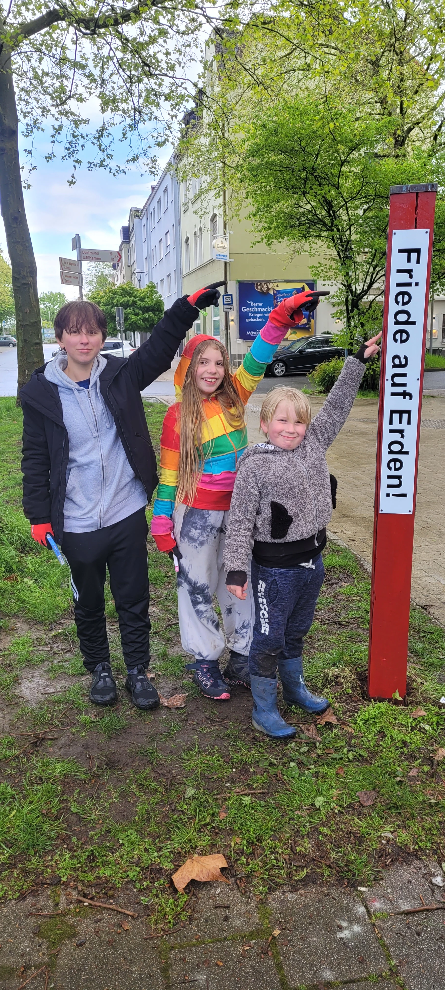 Am Freitag wurde – dem Regen zum Trotz – wenn auch ein wenig verspätet, der Friedensmahner vor dem Rathaus renoviert. Als die Gruppe am frühen Abend um den Friedensmahner stand und für den Frieden in der Welt betete, sagte Lukas, mit sieben Jahren der jüngste Teilnehmer: „Ich wünsche mir, dass überall auf der Welt Menschen wieder Ruhe finden und genug zu essen haben!“ Am Samstag transportierten die jungen Friedensengagierten einen Friedensmahner nach Methler.