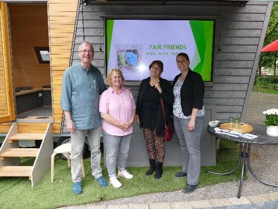 In einladendem Ambiente – unter roten Sonnenschirmen sitzend - erzählten die fair friends von ihrem bunten, vielfältigen fairen Engagement im Rahmen der Kinder- und Jugendarbeit und auf Veranstaltungen wie dem Kamener Adventsmarkt und den Wanderungen mit dem „roten Rucksack“. Eine PowerPoint Präsentation, auf dem großen Bildschirm am Tiny House zu sehen, illustrierte ihre bunte Arbeit.