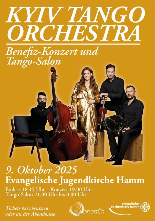 Am 9. Oktober 2025 kommt das Kyiv Tango Orchestra in die Evangelische Jugendkirche Hamm, Westhofenstraße 2, 59065 Hamm. Freuen Sie sich auf ein besonderes Benefiz-Konzert mit leidenschaftlicher Tango-Musik. Nach dem Konzert gibt es einen Tango-Salon, bei dem getanzt werden kann.