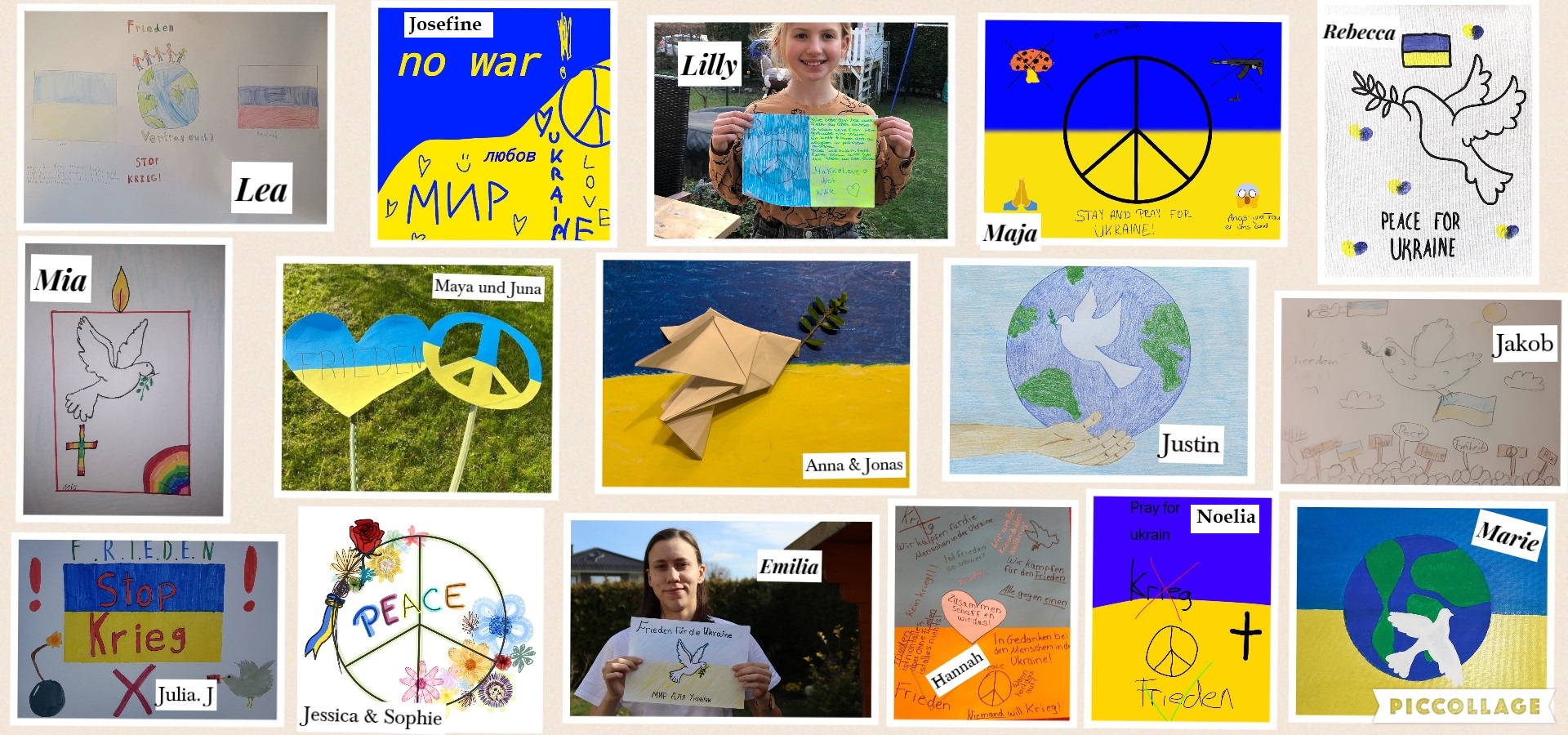 Jeden Tag sehen wir die Bilder aus dem Krieg, der in der Ukraine herrscht und das große Leid, welches die Menschen getroffen hat. Die ganze Welt vereint sich und sehnt sich nach Frieden und ein schnelles Ende des Krieges. So wollen auch wir als Messdienergruppe ein Zeichen setzen und haben eine kleine Aktion unter dem Namen „Zeichen für den Frieden“ gestartet. Wir haben Bilder für den Frieden gemalt und diese dann als Collage zusammengesetzt. Zusammen mit den folgenden Gebet möchten wir so ein Zeichen für den Frieden setzen und unsere Solidarität mit den Menschen in der Ukraine zeigen.