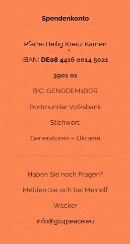 Am Sa./So., 17./18.12.2022 wird bei uns eine Kollekte für die Aktion „Stromgeneratoren für Bunker“ gehalten.