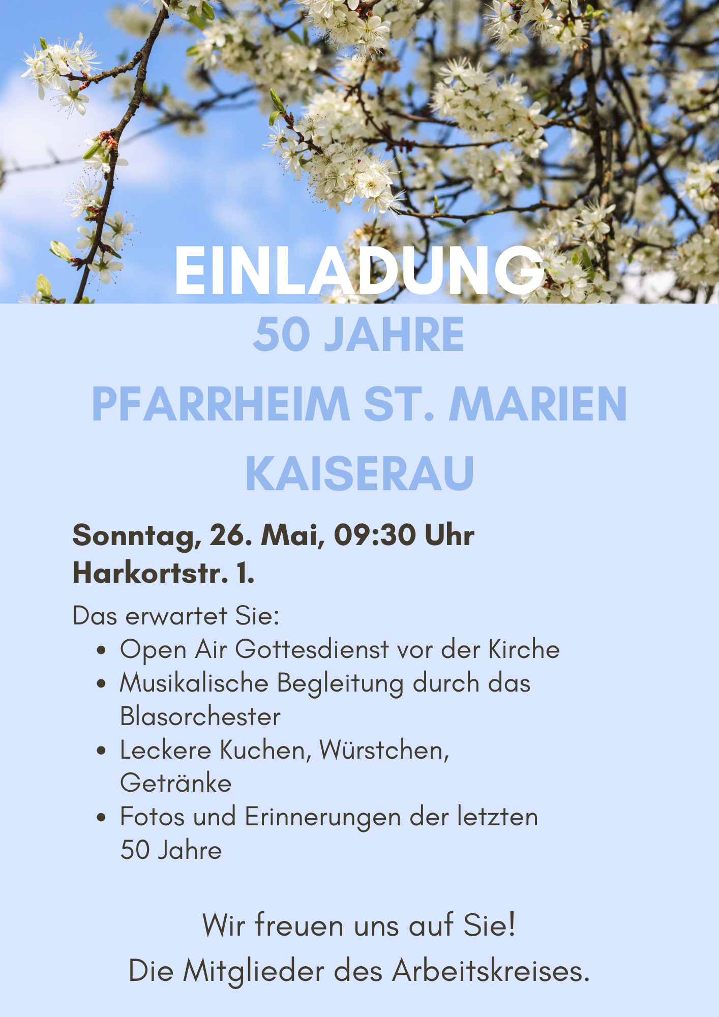 50 Jahre alt wird das Pfarrheim in St. Marien Kaiserau in diesem Jahr. Das soll gefeiert werden am Sonntag, dem 26. Mai 2024! Der Festtag beginnt mit der Messe um 9.30 Uhr, bei gutem Wetter draußen vor dem Pfarrheim. Das Blasorchester wird den Tag musikalisch begleiten, für das leibliche Wohl ist im Pfarrheim gesorgt, in Form von Würstchen, Kuchen und Getränken. Viele Fotos vom Baubeginn bis heute sollen die Geschichte des Hauses und dessen Gästen zeigen. Wir freuen uns über die persönlichen Erinnerungen der Gemeindemitglieder und hoffen auf zahlreiche Gäste.