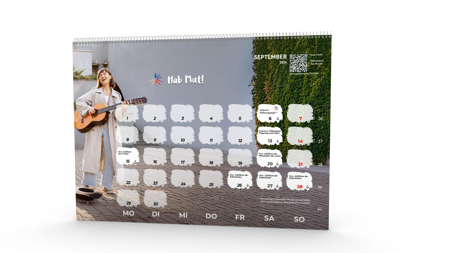 In diesem Kalender findest du die Jubiläen und Veranstaltungen des Heiligen Jahres, die im Vatikan, im Erzbistum Paderborn und im Netzwerk go4peace angeboten werden. Wir laden ein, all diese Begegnungen unter dem Horizont der Hoffnung betend zu begleiten. Die monatlichen Impulse sind als Texte im Kalender abgedruckt, können aber auch als Kurzvideos über QR-Codes aufgerufen werden. Lassen wir durch unser Erzählen und durch unsere konkrete Liebe dieses Jahr für viele zu einem Jahr echter Hoffnung werden.